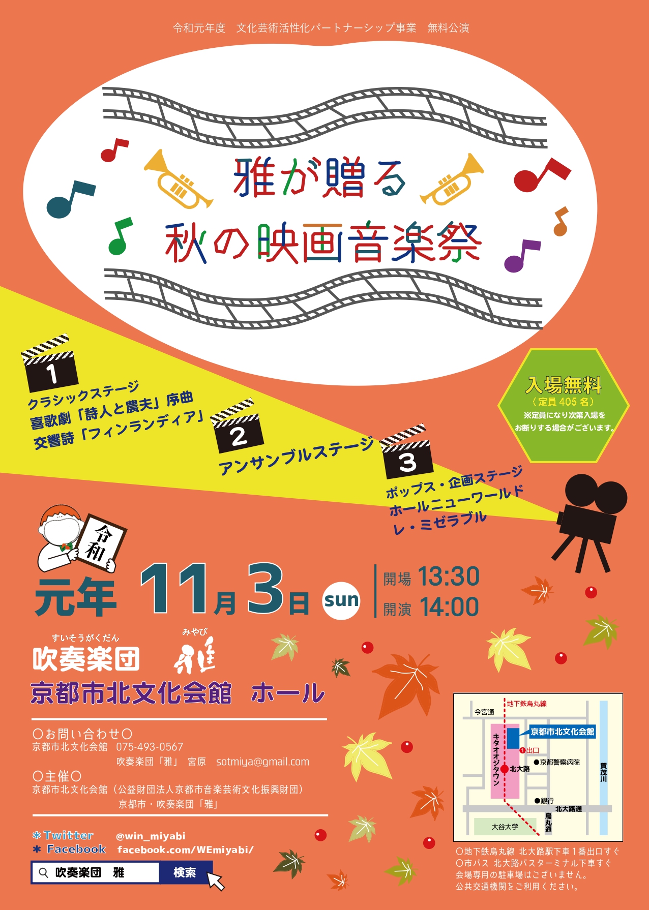 京都市北文化会館のパートナー団体である吹奏楽団「雅」は、今回「雅が贈る秋の映画御音楽祭」を開催します。題名のとおり、第1部と第3部では映画で使用されている曲をいくつかピックアップし、第2部ではアンサンブルステージをお送りします。