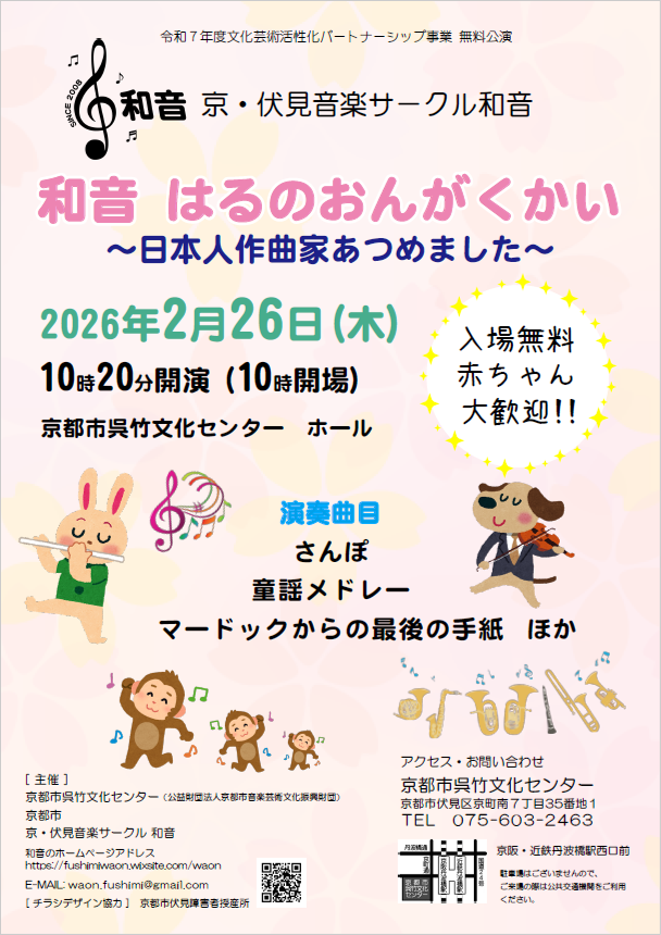 京都市呉竹文化センターのパートナー団体として活動する京・伏見音楽サークル和音による無料公演を開催します。