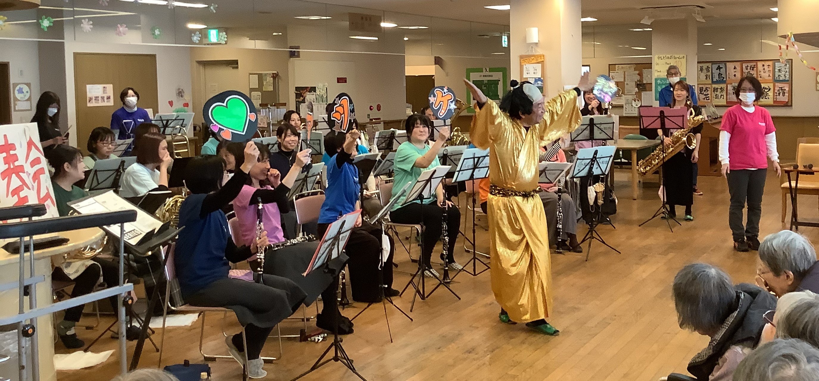 催しに訪れた施設利用者や地域住民の皆さまの前で、「さんぽ」、「勇気100%」、「童謡メドレー」、「マツケンサンバ2」を演奏しました。