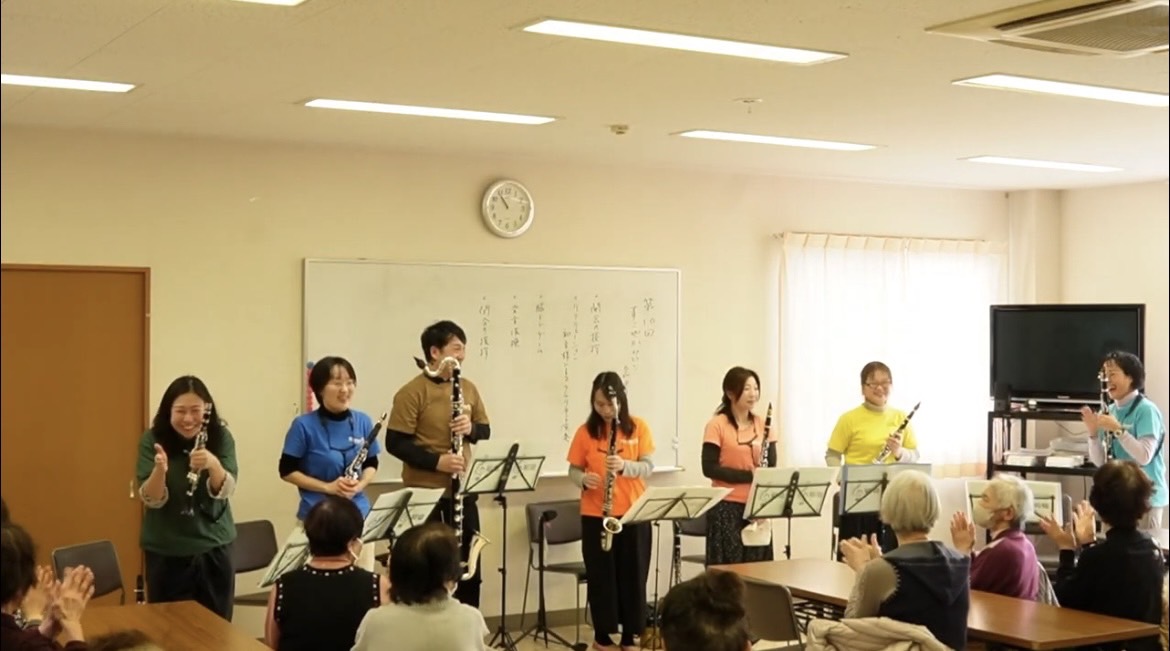 催しに訪れた施設利用者とご家族、施設の職員約40名の前で、「365日の紙飛行機」や「クラリネットこわしちゃった」、「アメイジング・グレイス」等の曲を演奏しました。