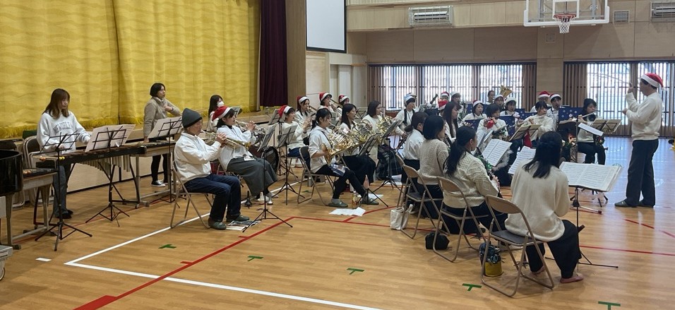 当日は、児童・生徒の前で、以下の曲目を演奏いたしました。 「We Wish You a Merry Christmas in Brass Rock」、「You Raise Me Up」、「戦場のメリークリスマス」、「愛の賛歌」、「J-POP Stage Vol.1【A・RA・SHI〜Monster】」