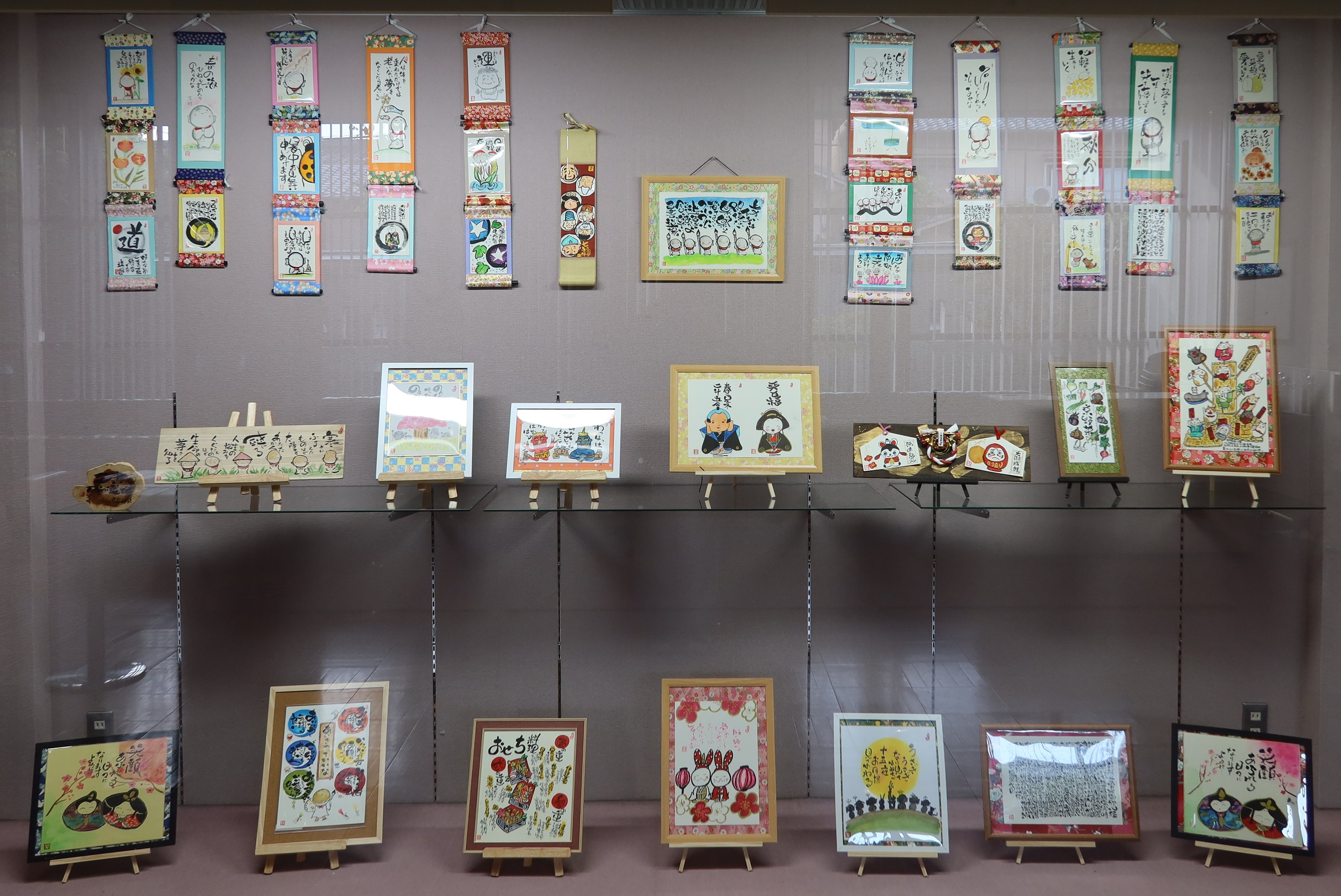 今月は、書教室「愉しい筆あそび」作品を展示しています。