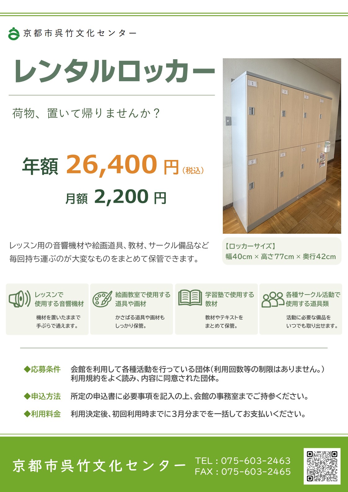 京都市呉竹文化センターでは、ご利用者様の利便性の向上と施設内空きスペースの有効活用を目的とした「レンタルロッカー事業」を実施しております。