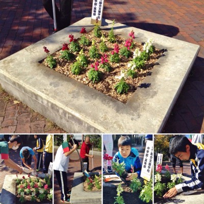 支援学校の高等部農園芸班の皆さんが育苗してこられたお花です。花壇がパーッと華やかになりました。