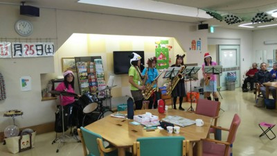 11月25日(土)、老人保健施設の桃寿苑にお伺いしサックスとドラムのアンサンブル演奏を聴いていだたきました。