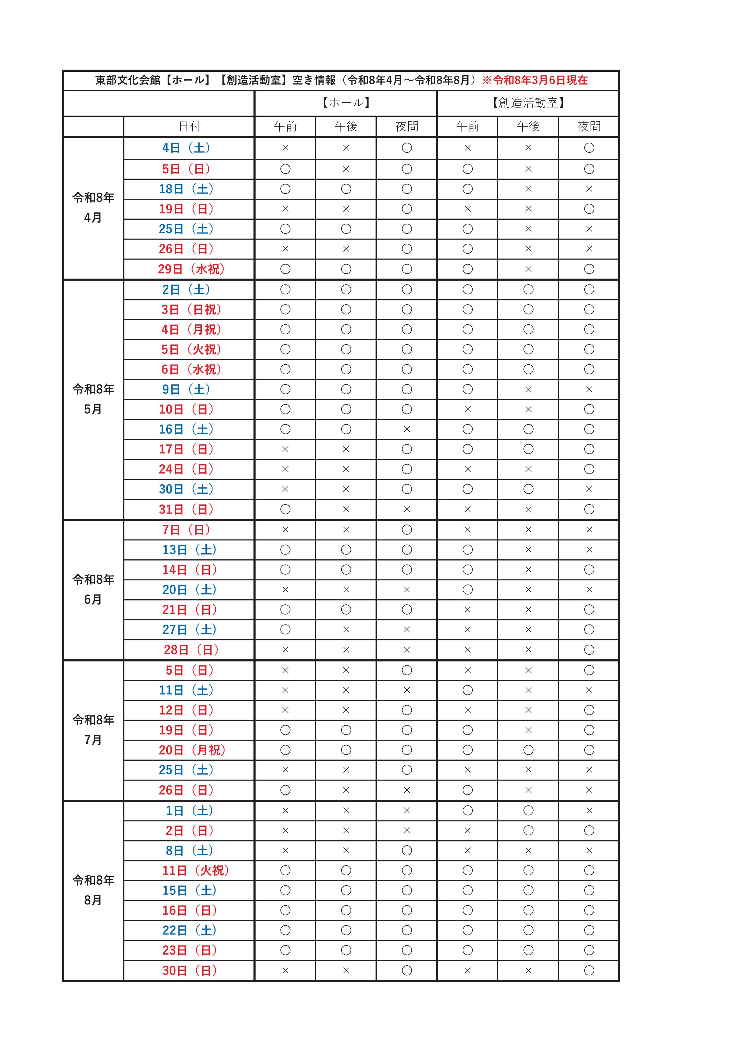 【最新】ホール・創造活動室 空き状況(令和8年4月〜令和8年8月)