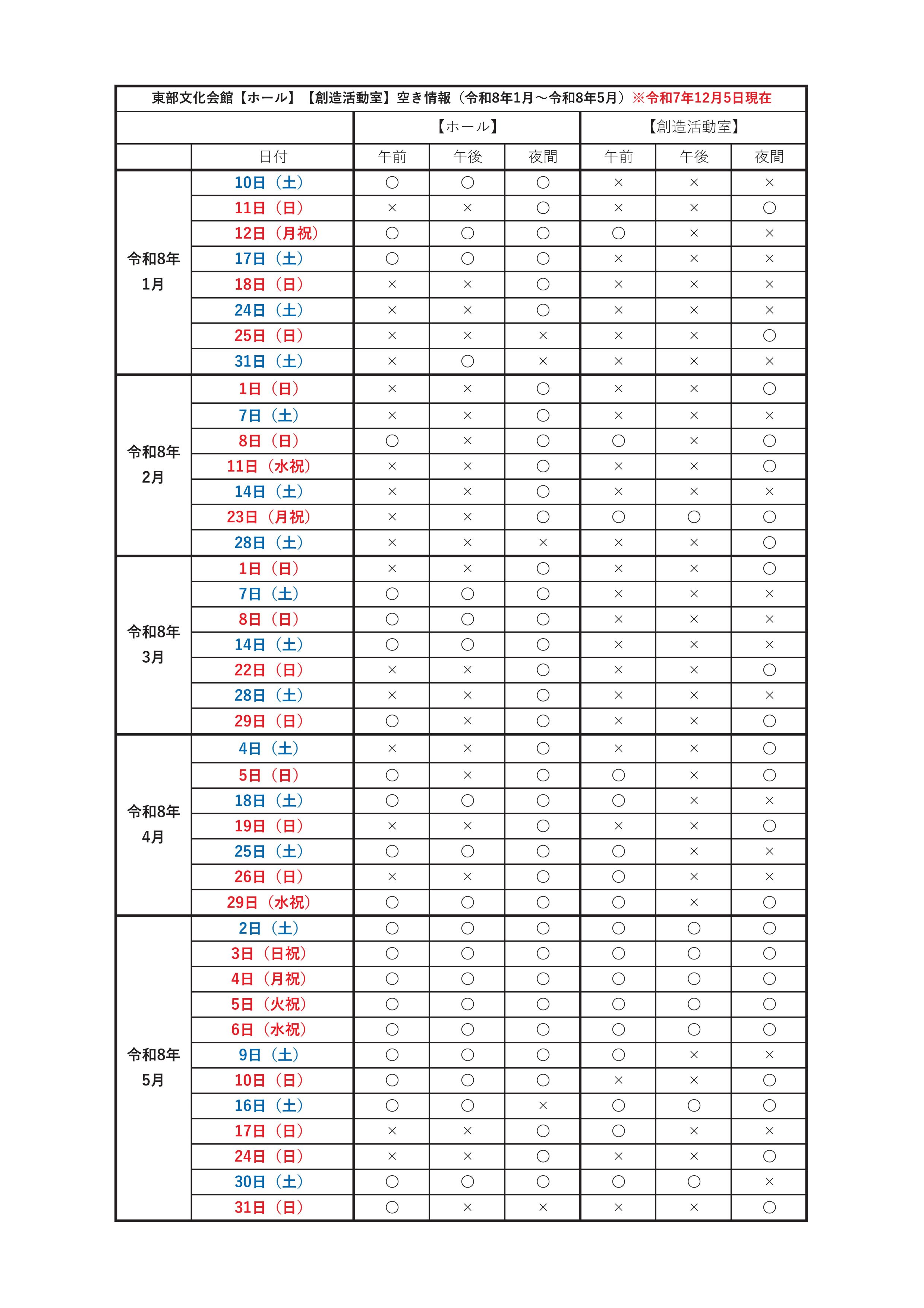 【最新】ホール・創造活動室 空き状況(令和8年1月〜令和8年5月)