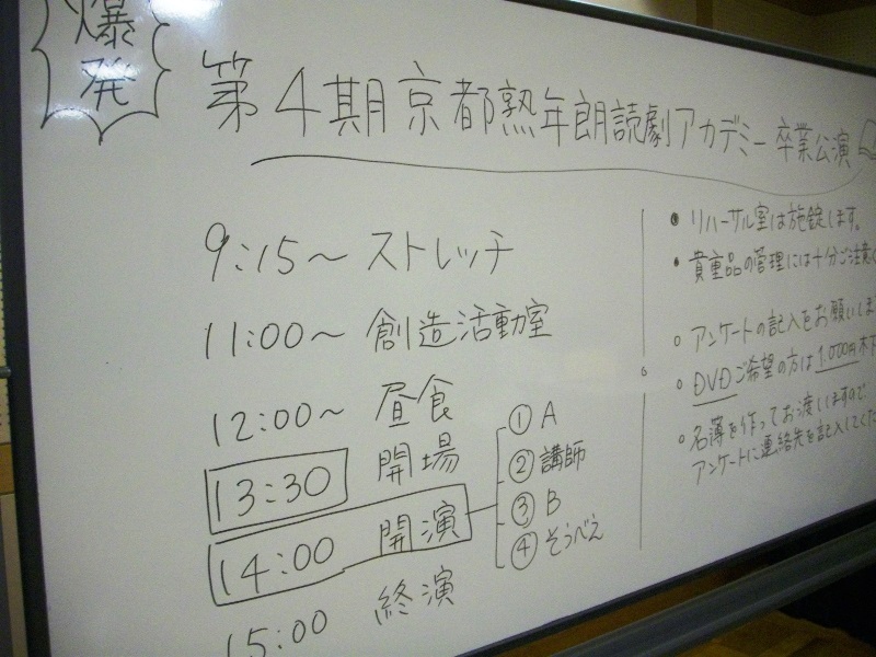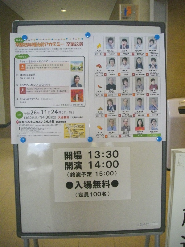 絶好の行楽日和となった三連休の最終日、11月24日(月・祝)に『第4期 京都熟年朗読劇アカデミー』の卒業公演を行いました。