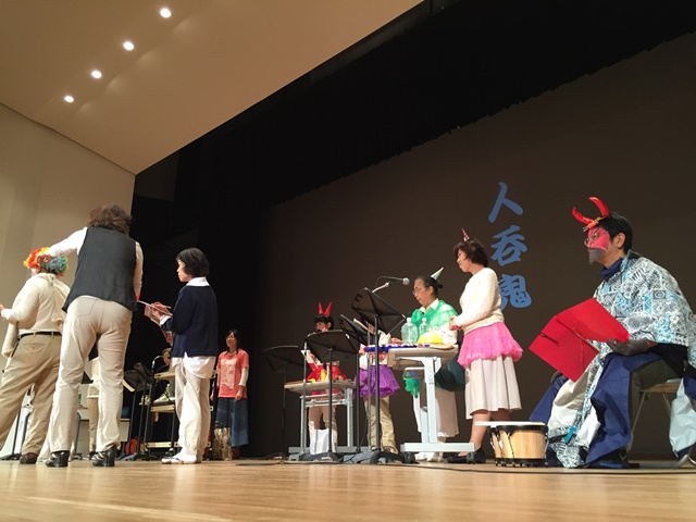 朗読劇は一般的には立ったままや座ったままでお話を読みますが、今回の公演ではメンバーが自分の声や楽器などを使って効果音を出しで情景を描き出し、メインキャストたちは身振り手振りも交えてのちょっとしたお芝居仕立てにして熱演しました。