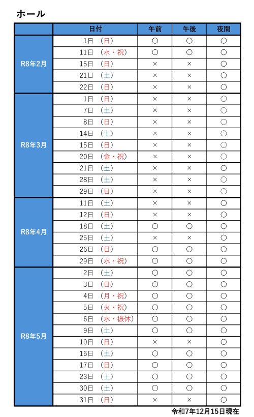 【お知らせ】土・日・祝のホール空状況について(令和8年2月〜令和8年5月)